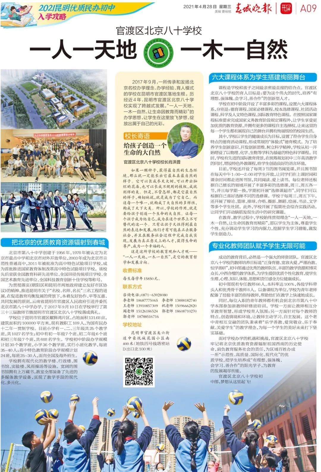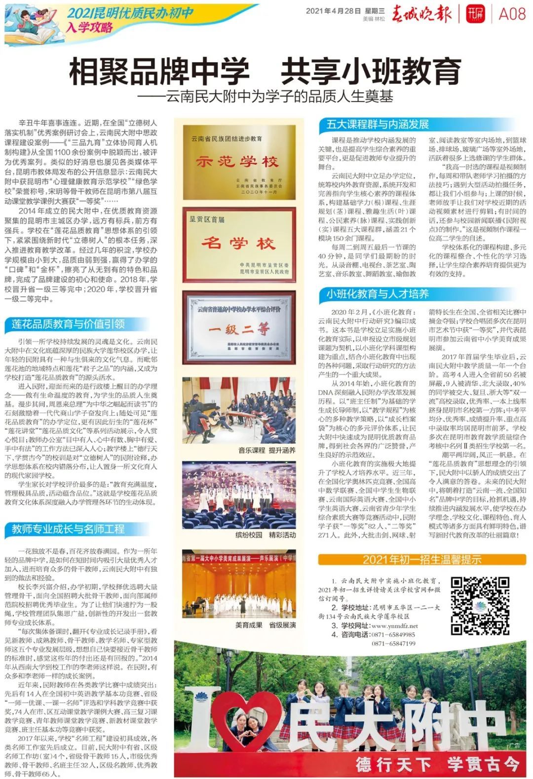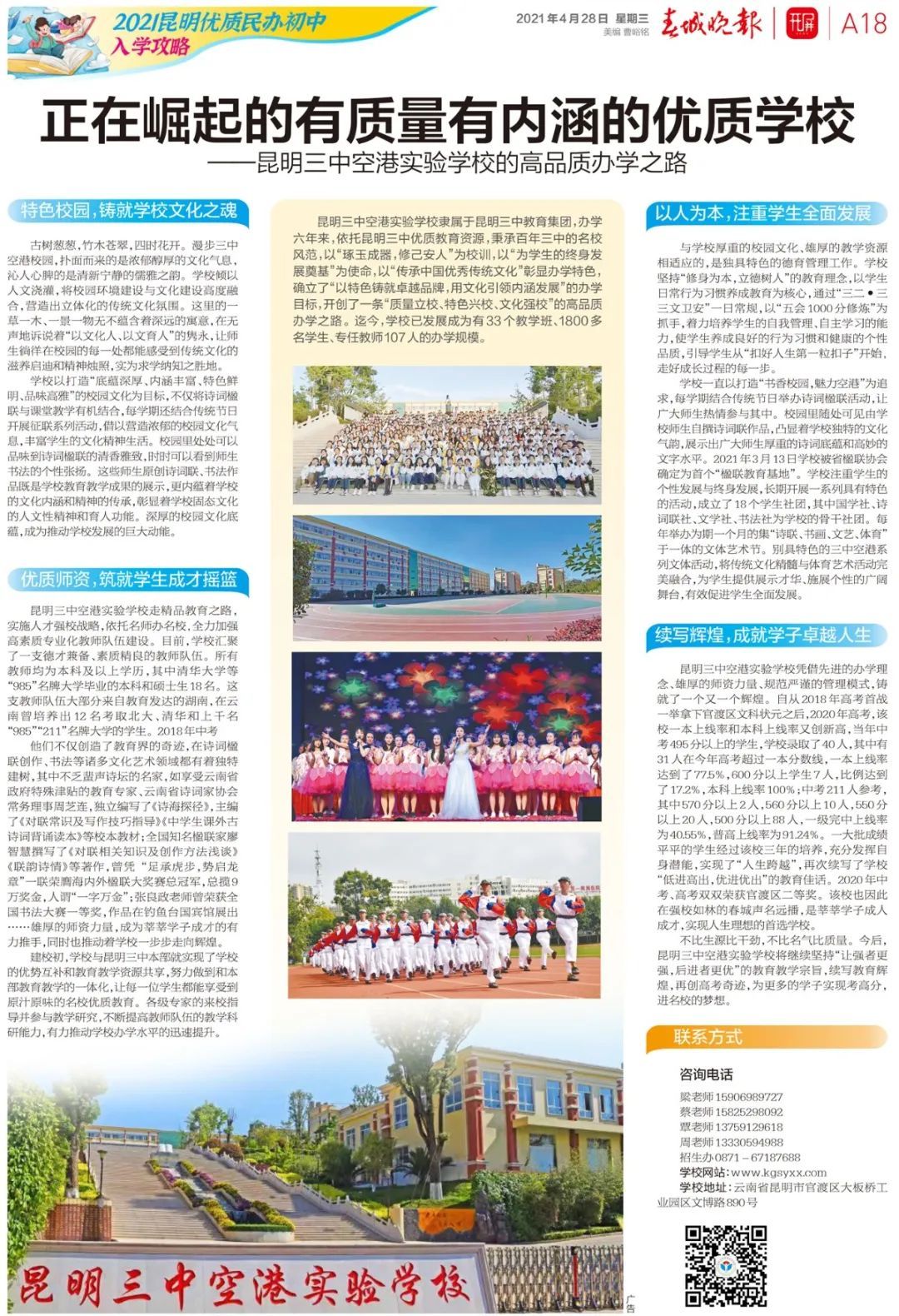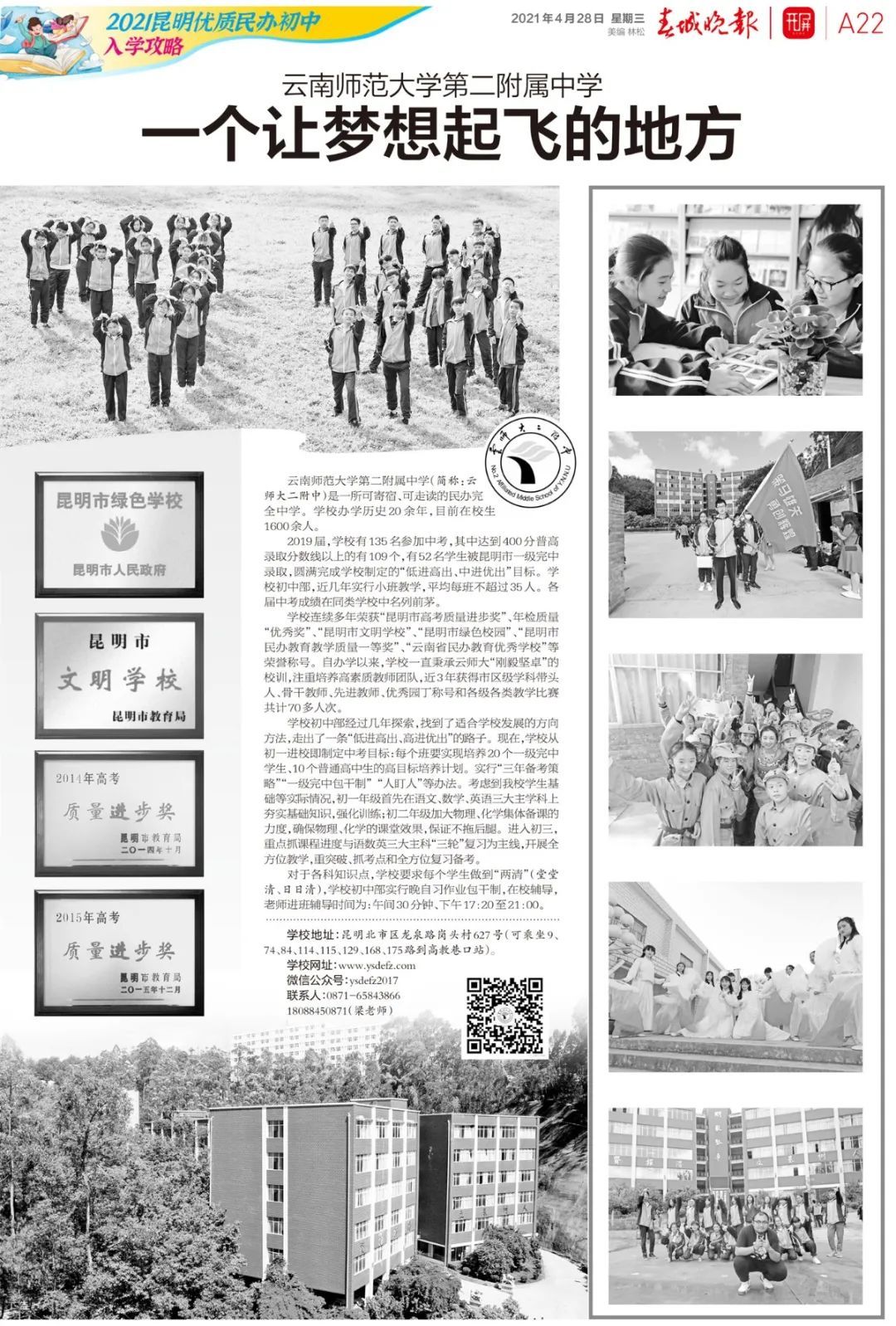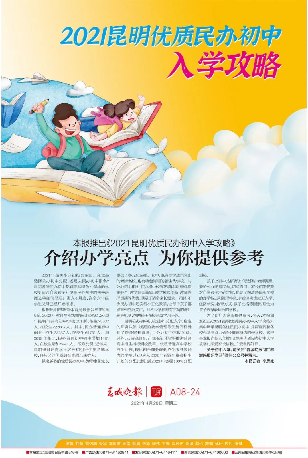 为了给广大家长提供参考,今天,本报独家推出《2021昆明优质民办初中入学攻略》,集中展示昆明各优质民办初中,并深度揭秘各校办学亮点,为家长推荐身边的好学校。这已是本报连续六年推出《昆明优质民办初中入学攻略》,深受家长信赖,广受各界好评。