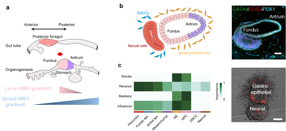 (a)胃器官发生早期胃底-胃窦组织图式形成的示意图;(b)类胃囊免疫荧光染色鉴定及组织结构示意图;(c)神经组织是调控胃器官前后组织图式发育的WNT信号中心