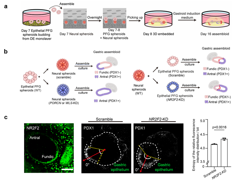 (a)微尺度组织定向组装技术流程示意图;(b)对类胃囊中不同谱系的组织模块独立开展基因编辑;(c)上皮源NR2F2是决定胃组织非对称图式发育的关键因子