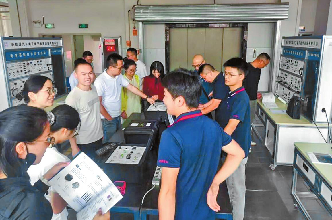 近日,北京汇智慧众汽车技术研究院专家团队走进玉溪技师学院城市建设与交通运输学院,开展新能源汽车电工电子技术师资培训。培训现场,专家围绕新能源汽车电工电子教学训练考核平台展开详细讲解与演示。据介绍,该平台涵盖电学基础教学训练、综合技能考核两大模块,可实现从理论到实操的全流程教学支持,为教师教学、学生学习提供有力保障。参训教师仔细聆听讲解,近距离观察设备操作流程,积极与专家交流互动,共同探寻在新能源汽车电工电子技术教学过程中的问题和解决方案。(通讯员 李清 摄)