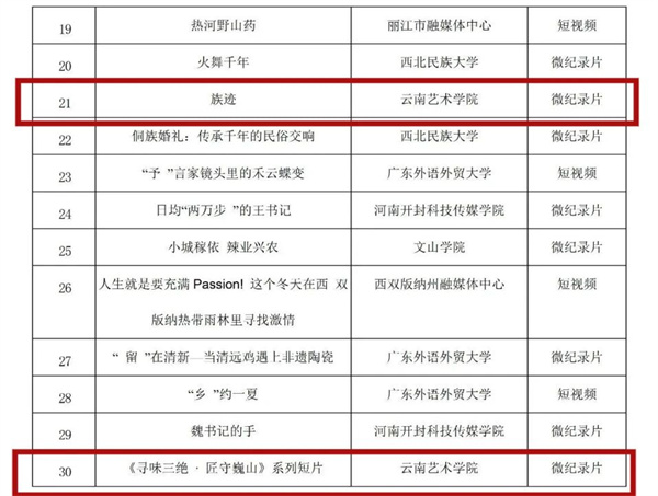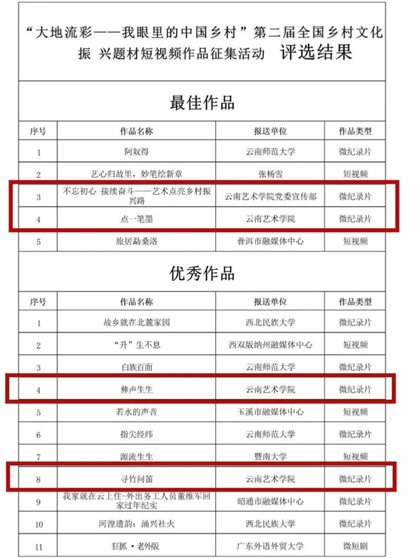 近日,由云南省文学艺术界联合会、云南广播电视台联合主办,云南省电视艺术家协会、云南省电影家协会共同承办的“大地流彩——我眼里的中国乡村”第二届全国乡村文化振兴题材短视频作品征集活动公布获奖名单。云南艺术学院表现亮眼,共有7部作品从全国征集作品中脱颖而出斩获奖项,其中《不忘初心 接续奋斗——艺术点亮乡村振兴路》《点一笔墨》两部作品荣膺“最佳作品”奖。