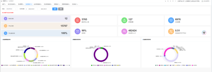 数字赋能创新工作模式。学校推进团学工作数字化转型,构建“线上+线下”融合模式,集成活动报名、学习资源、服务预约等功能。平台全年参与人数达48万余人次,活动签到率99%,实现学生活动精准高效管理。