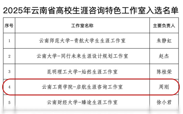 近日,云南省教育厅公布了2025年高校就业创业指导金课和生涯咨询特色工作室入选名单。云南工商学院“启航生涯咨询工作室”入选省级生涯咨询特色工作室,标志着学校在生涯教育与就业指导服务方面获得了省级权威认可。
