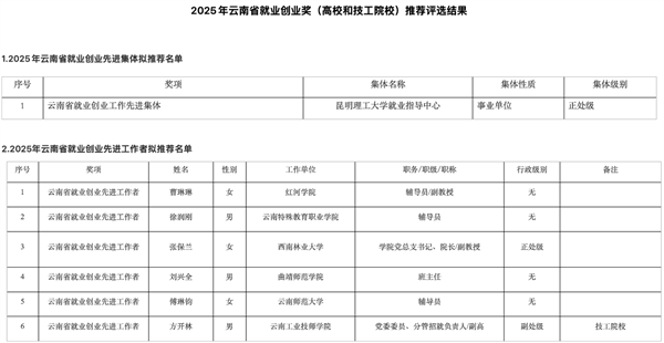 根据《中共云南省委办公厅 云南省人民政府办公厅关于开展2025年云南省就业创业奖推荐评选工作的通知》精神,经组织高校和技工院校推荐、专家评审和综合考核,共推荐云南省就业创业工作先进集体候选1个、云南省就业创业先进工作者候选6名(含技工院校1名)。