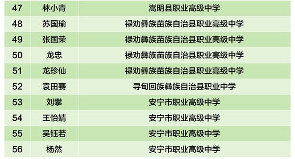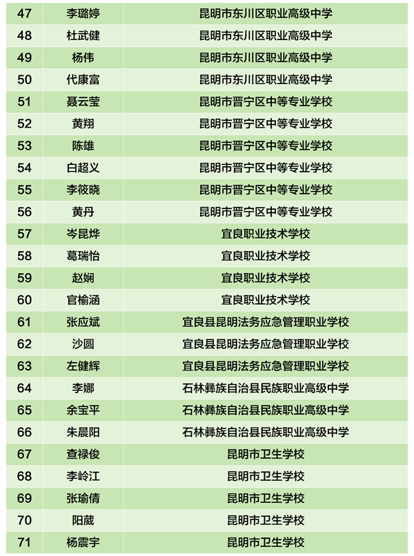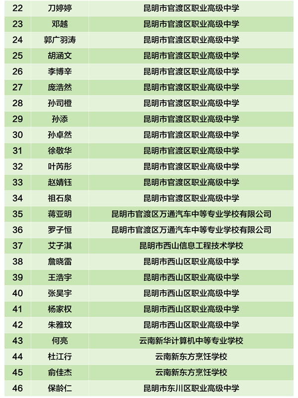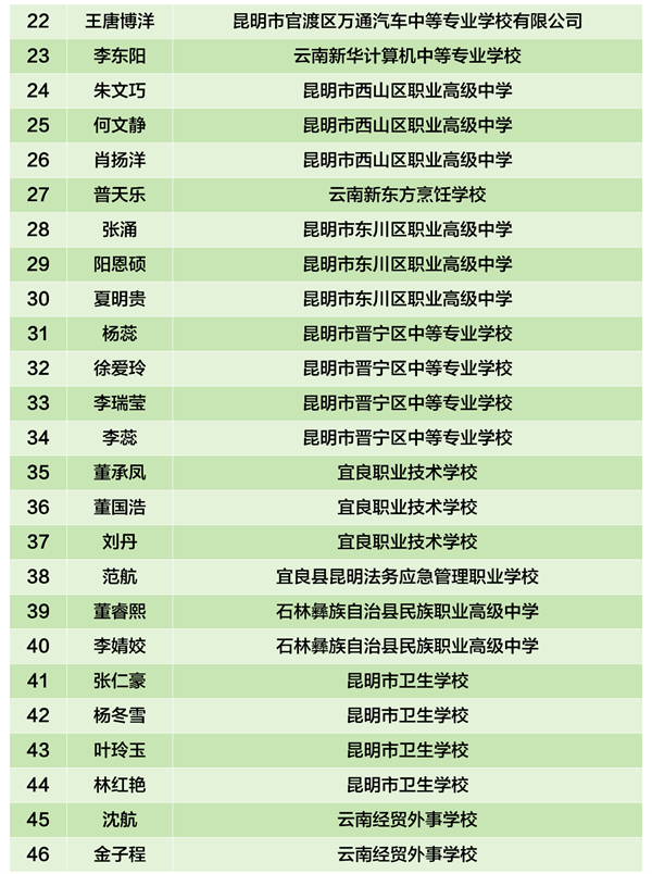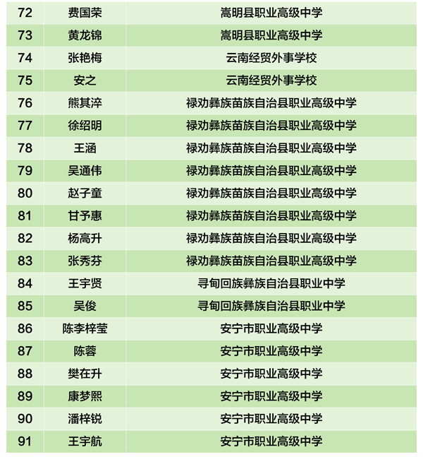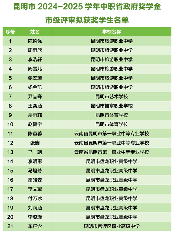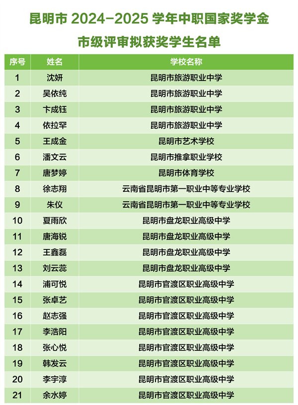 根据《中等职业教育国家奖学金评审办法》(教财〔2023〕11号)、《云南省中等职业学校省政府奖学金管理暂行办法》(云财教〔2009〕243号)、《关于做好2025年中等职业教育国家奖学金评审发放和材料报送工作的通知》(教助中心〔2025〕22号)、《云南省教育厅 云南省人力资源和社会保障厅关于做好2025年中等职业教育国家奖学金省政府奖学金评审发放和材料报送工作的通知》要求。昆明市已完成2024—2025学年中职国家奖学金和中职省政府奖学金市级评审。现将市级评审拟获奖学生名单公示如下。