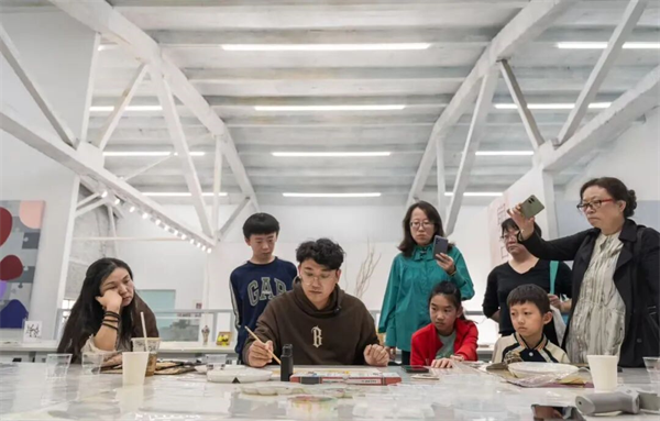 活动现场,杜健亲自示范山水画的核心技法,展示了如何运用披麻皴、斧劈皴等不同皴法表现山石的各异质感。通过对其笔墨语言与造境的解读,引导公众理解了不同时代山水画在造境理念与笔墨表达上的演变与传承。在“零基础体验沙龙”环节,参与者还在专业教师的指导下,亲身体验山石、树木等经典元素的画法,完成了各具特色的水墨作品。