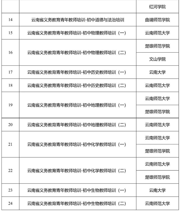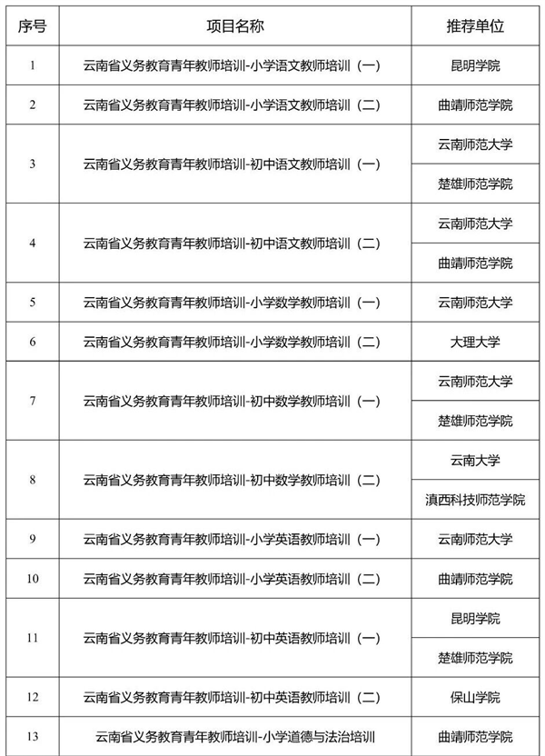 按照《云南省教育厅关于公开遴选第四期义务教育青年教师培训计划项目承训单位的通知》要求,经专家评审、综合评分、推荐汇总等环节,拟由云南师范大学等10家单位作为第四期义务教育青年教师培训计划省内遴选项目承训单位。