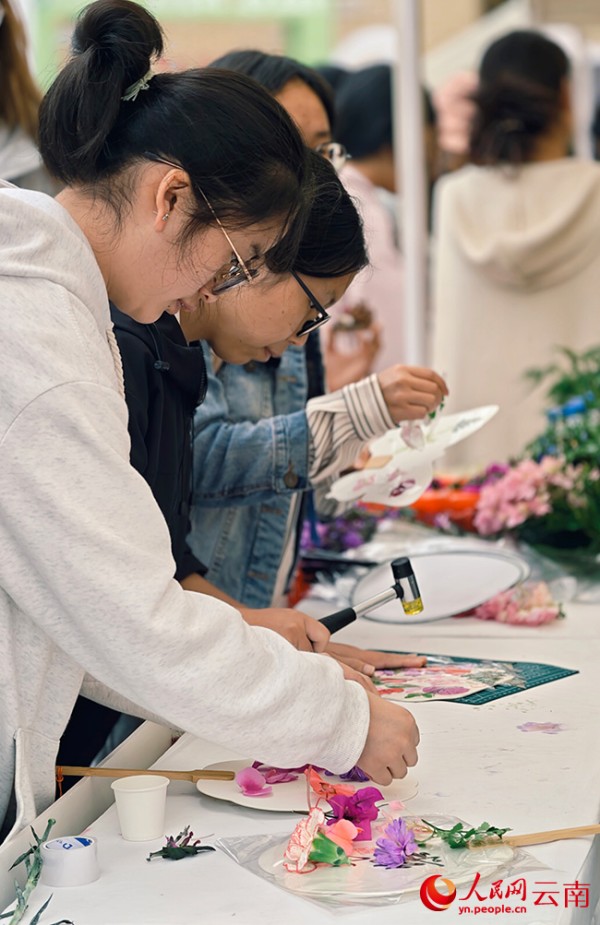 学生们锤草印花制作扇子。人民网 尹馨 摄
