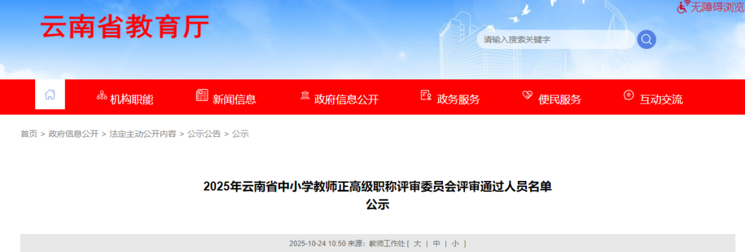 10月24日,云南省教育厅公示2025年云南省中小学教师正高级职称评审委员会评审通过人员名单。