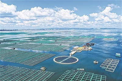 近年来,作为海洋渔业大省的山东积极建设海洋牧场,耕海牧渔聚力充盈“蓝色粮仓”。截至目前,山东已建成省级以上海洋牧场139处,其中国家级71处、占全国的38%,并形成了从养殖、捕捞到精深加工全产业链条。图为山东省荣成市桑沟湾海洋牧场生态网箱养殖区。