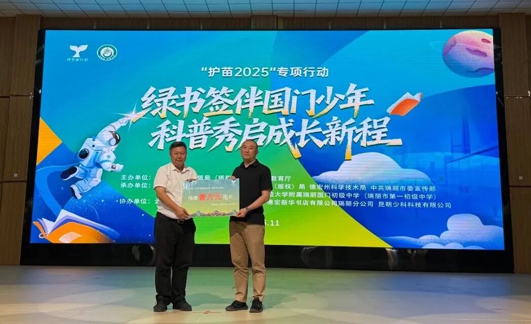 省委宣传部反非法反违禁处、云南美术出版社现场向瑞丽市第一初级中学捐赠一批优质的青少年读物,扩充学校图书资源,让书香满溢国门校园。省委宣传部、省教育厅相关同志为学生代表赠送象征着纯净阅读与健康成长的“绿书签”。学生可持书签享受新华书店相应购书折扣,畅享绿色阅读。