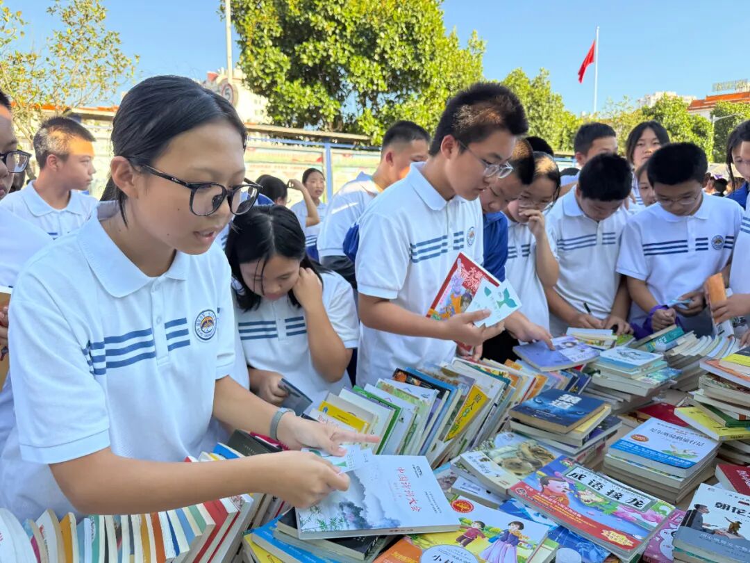 “1本旧书换1张交换券,可换其他书籍。”老师现场号召学生们积极参与图书交换活动,阅读正版书籍。展区前人群拥挤,学生们一头扎进成堆的书籍中,挑选自己心仪的读物。