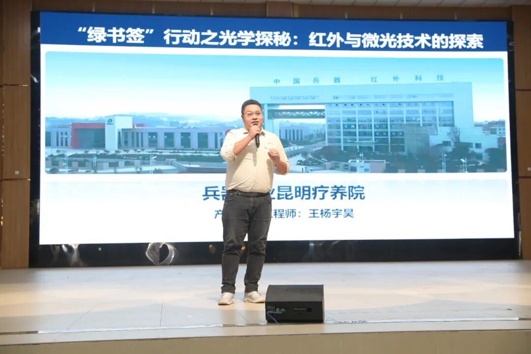 兵器工业昆明疗养院产品架构工程师王杨宇昊现场开展《红外与微光技术的探索——“绿书签”行动之光学探秘》主题讲座,结合案例讲解红外与微光技术的区别,介绍夜视装备在军事中的应用,鼓励在场学生积极探索科学奥秘,主动学习先进科学知识,为推动技术创新、守护国家安全贡献力量。