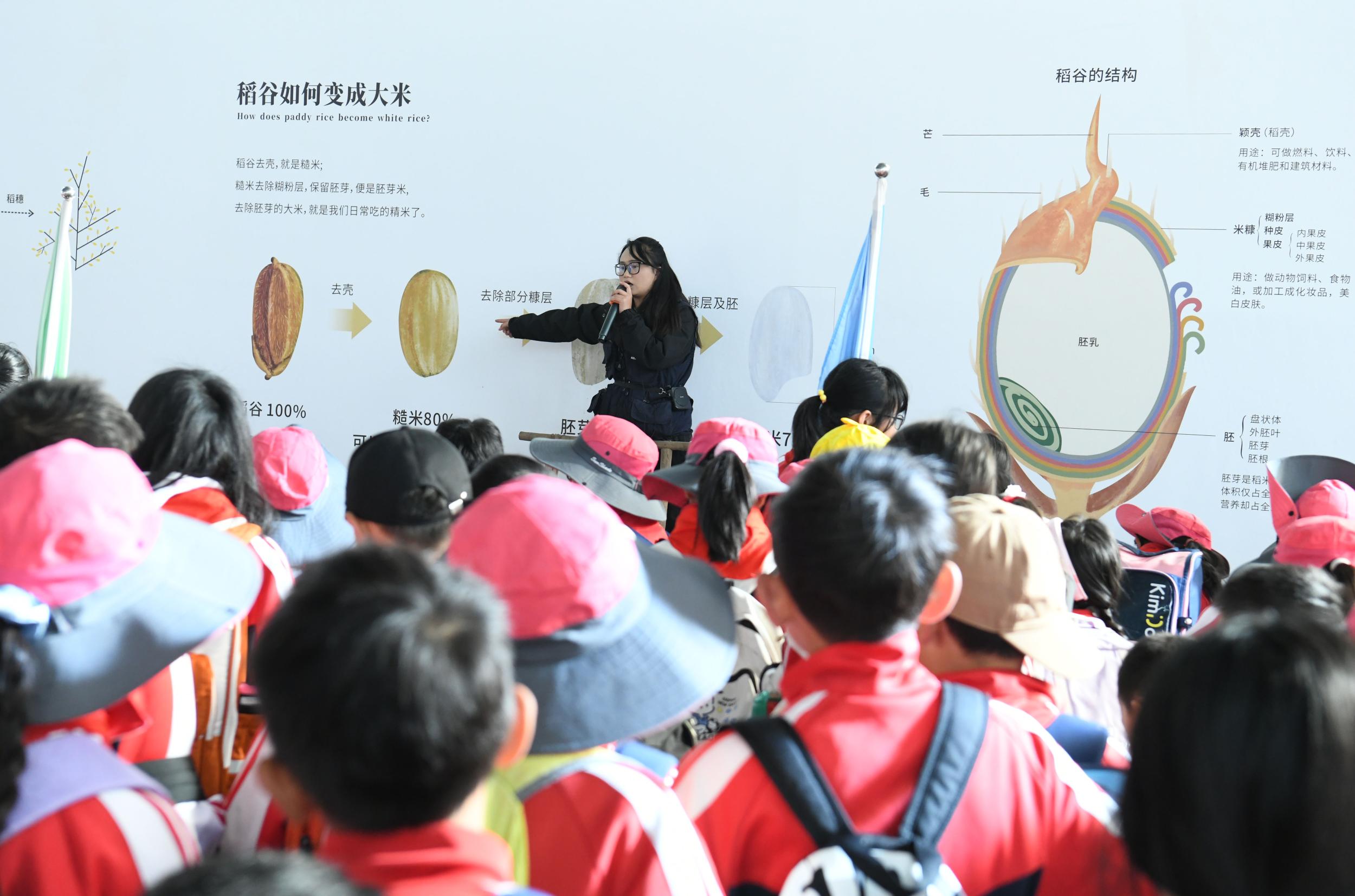 在古城区开南街道美自壹丘田校外劳动教育实践基地,工作人员向同学们科普了水稻的“一生”,让同学们全面认识和了解水稻的生长过程和农耕农具的使用方式,随后分享了袁隆平的故事,并讲解了水稻收割的知识。