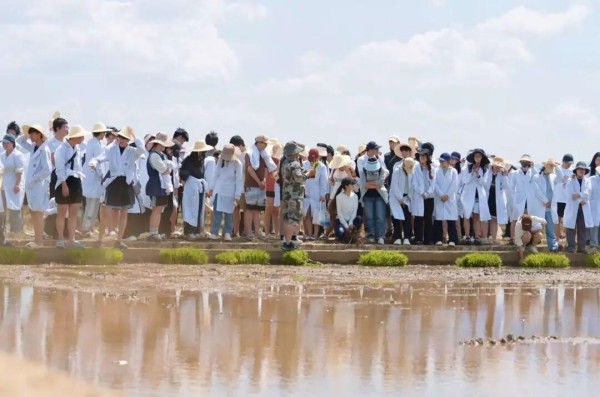 图为学生在劳动基地体验插秧