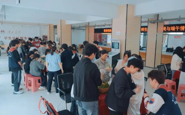 图为“一站式”学生社区端午节包粽子活动