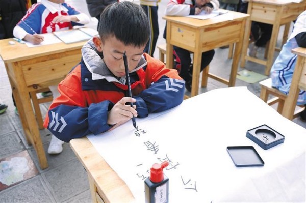 翰墨区人气十足,各班推选出的学生代表在这里进行书法创作。孩子们屏息凝神,一笔一画地认真书写。在孩子们创作的作品中,既有飘逸灵动的软笔书法作品,也有工整清秀的硬笔书法作品,这些作品整齐摆放,尽显汉字之美与书法之雅。