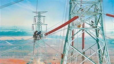 图为天津送变电公司工作人员在津南500千伏输变电工程现场开展引流线安装作业。(范明怡摄)(陈曦)