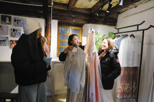 手作区可以体验掐丝珐琅、刻簪、非遗烧泊画、漆扇、石膏娃娃……最受欢迎的是非遗“盲盒”,客人可以随机抽取材料包,在店员及匠人的指导下完成作品;茶饮区的围炉煮茶,可体验彝族烤茶;展柜里摆着的手镯、项链、耳环等,都是曾美从村民手中收购回来的老物件。