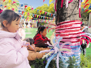 12月24日,东华幼儿园大一班李乐一、大三班王影潇等孩子围在滇朴树旁忙碌着,他们想给穿上“新衣”的大树增添一些装饰品,让大树看起来更可爱、更美丽。