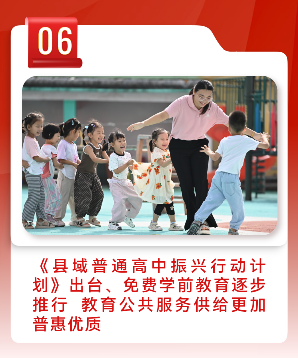 为加快推动城乡普通高中教育协调发展,促进县中振兴,经国务院同意,9月18日,教育部等六部门联合印发《县域普通高中振兴行动计划》,对推进县域普通高中教育高质量发展进行了系统设计和全面部署,让县中真正强起来、优起来。这是办强办优基础教育、夯实教育强国基点的战略举措,关系成千上万学子特别是农村孩子的成长成才。《行动计划》明确了五大任务、部署了八大行动,提出到2030年,适应学龄人口增长的普通高中教育资源供给机制进一步完善,县中布局更加合理,教育治理能力和水平显著提高,城乡教育协调发展的机制更加完善,市域内普通高中发展差距明显缩小,优质特色多样发展的格局基本形成,更好满足人民群众接受优质普通高中教育的愿望。一年来,教育公共服务供给更加普惠优质:国务院办公厅印发《关于逐步推行免费学前教育的意见》,推进学前教育普及普惠安全优质发展,从2025年秋季学期起,免除公办幼儿园学前一年在园儿童保育教育费,今年秋季政策惠及超过1200万儿童;优化与人口变化相适应的基础教育资源布局工作全面启动,为教育支撑人口高质量发展提供坚实保障;开展基础教育“规范管理提升年”行动,进一步清理整治违背教育规律、侵害群众利益的办学治校行为。