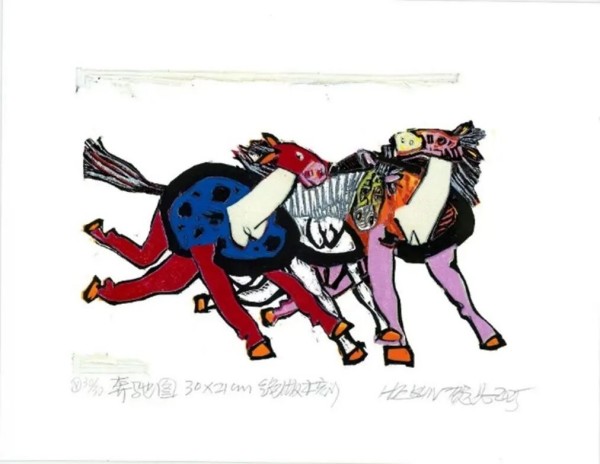 贺昆 《奔驰图》 绝版木刻 21×30cm