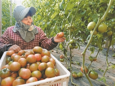 近年来,河北献县依托瓜菜新品种培育与病毒检测技术,构建起源头防控体系,形成番茄、甜瓜、小葱等20余种品类的全产业链。通过推广轮作模式,番茄和甜瓜等实现每年8月至次年4月持续上市,保障了瓜菜品质与全季节供应。图为1月1日,河北献县建林种植合作社员工在采摘“铁皮”番茄。
