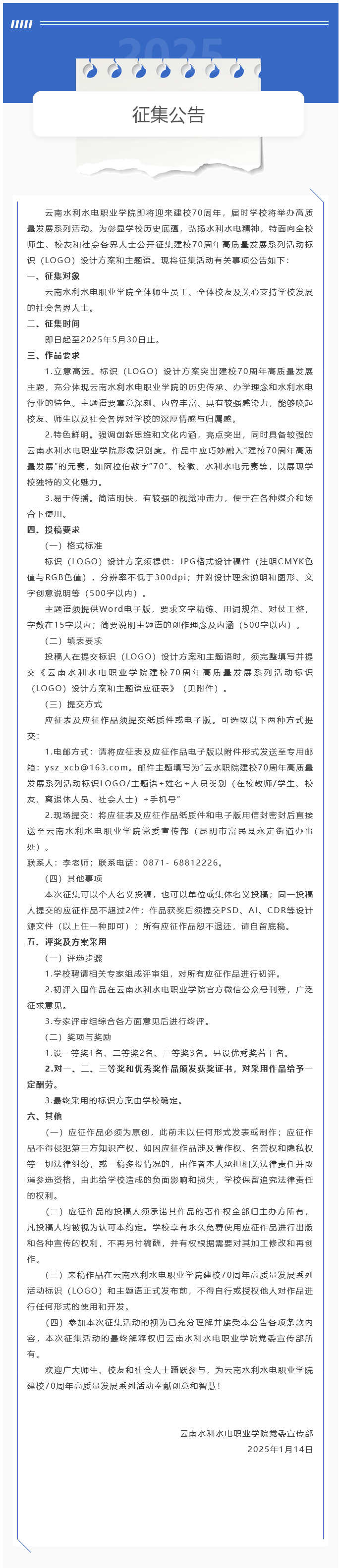 原标题:云南水利水电职业学院建校70周年高质量发展系列活动标识设计方案、主题语征集公告