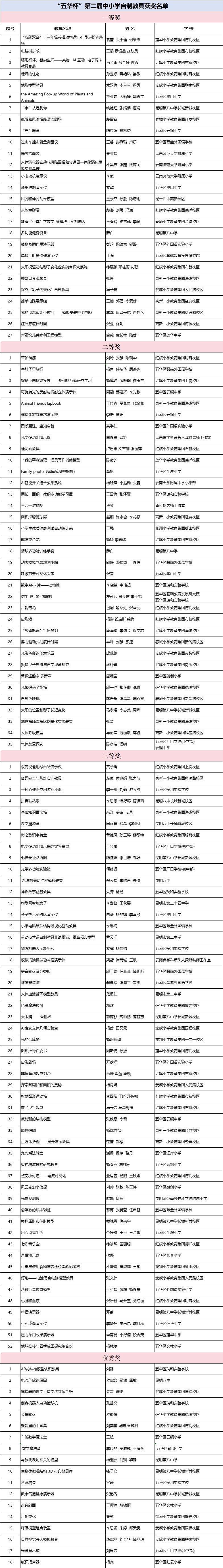 看点 2026年1月9日,昆明市五华区科学教育协同育人创新中心与五华区基础教育发展研究院公示了“2025年‘五华杯’中小学自制教具比赛获奖名单”,132件兼具创新性与实用性的教具作品脱颖而出。