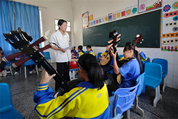 晨光刚漫过山梁,德宏傣族景颇族自治州陇川县民族小学的音乐教室里已传出悠扬的乐声。古筝清越如泉、中阮温润似语、葫芦丝悠扬婉转、中国鼓节奏铿锵,一支由8名小学生组成的民乐团正专注排练原创曲目。孩子们用略显稚嫩却坚定的手法拨动琴弦,额头上沁出细密汗珠。站在他们身旁的昆明城市学院艺术学院支教老师陈家懿轻声鼓励:“别着急,慢慢来,跟着你内心的节奏……”