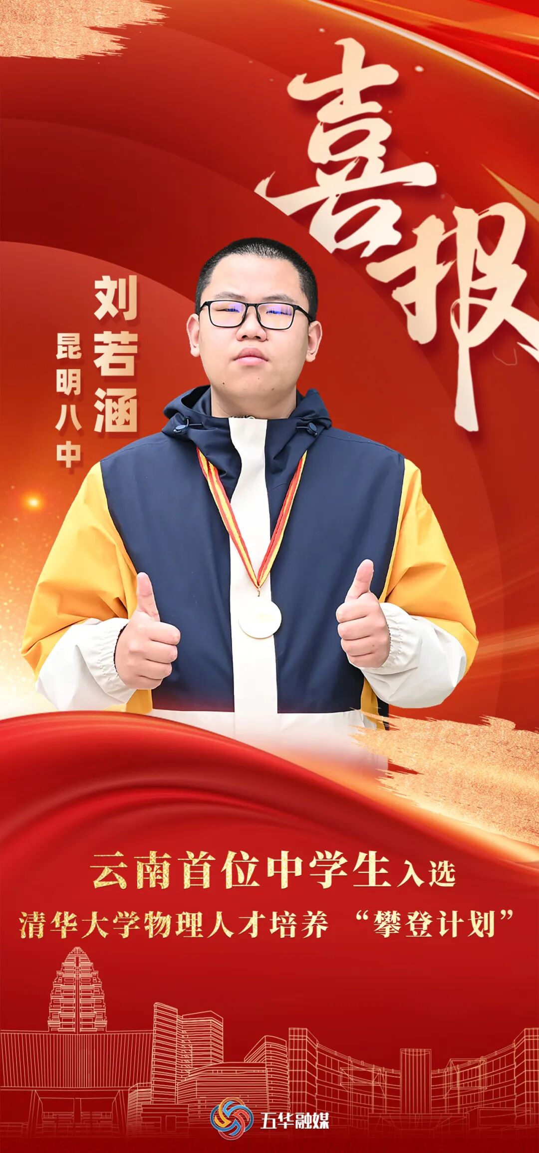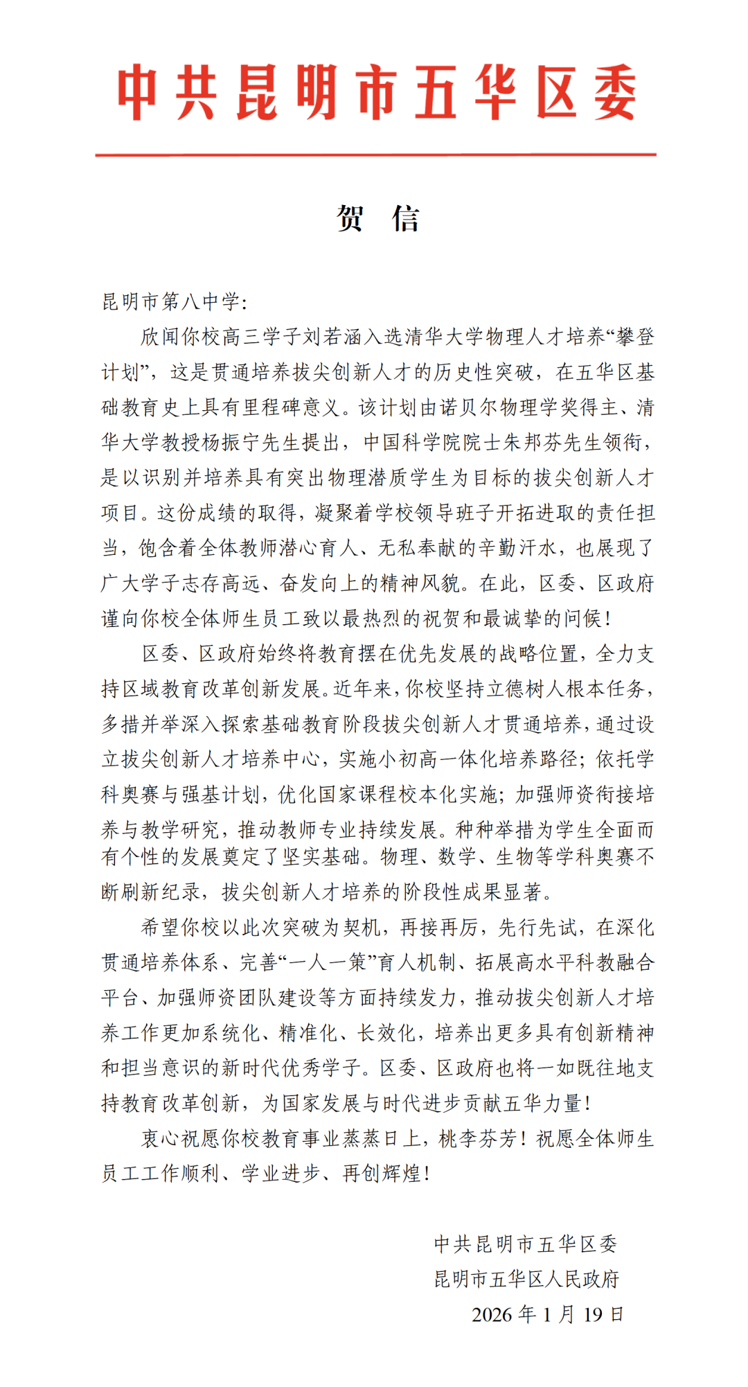 2026年1月18日,昆明市第八中学高三年级刘若涵同学历经三轮严苛选拔,成功入选清华大学物理人才培养“攀登计划”(以下简称“攀登计划”),成为云南省首位获此殊荣的中学生。