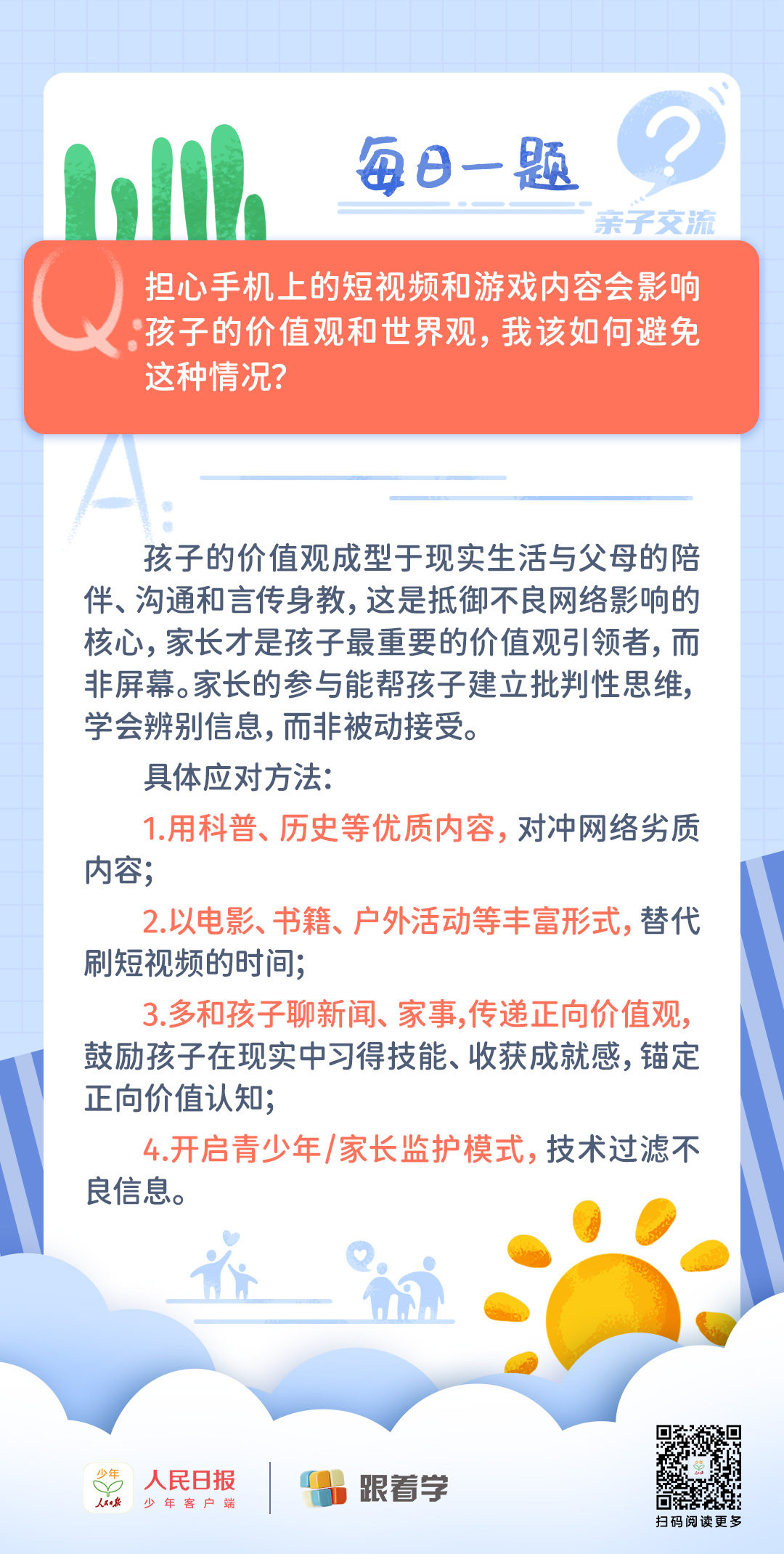 原标题:每日一题丨家长该如何避免手机上的内容影响孩子的价值观和世界观?