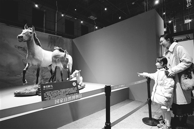 2月13日,由国家自然博物馆与中国文物报社联合主办的“马舞新春——全球生肖文化联展”在国家自然博物馆启幕。展览以“马”为主题,遴选了76件珍贵展品,内容涵盖自然科学与人文历史两个维度。观众可以通过详实的马种介绍、生动的化石标本,追溯马跨越5600万年的演化奇迹,为公众献上一份独具韵味的新春文化贺礼。图为观众观看被誉为“活化石”的国家一级保护动物普氏野马标本。