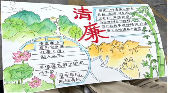 课堂作为廉洁教育主阵地,学校着力打造“专业讲、人人讲、经常讲”的浸润氛围。教师深挖各学科清廉元素,将诚信、节俭、感恩等教育融入课堂教学,让学生在专业学习中感悟廉洁内涵、强化价值认同。为打破单一教学局限,学校创新推出“班会领学+研讨交流+心得撰写+特色实践+榜样引领”多元模式,通过“廉洁公式”创作、“廉洁坐标系”黑板报设计等特色活动,破解“廉洁与学生无关”的认知误区。