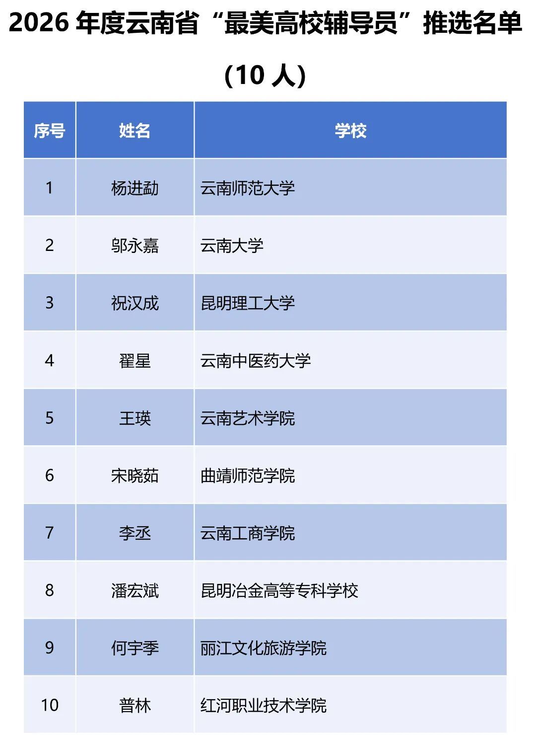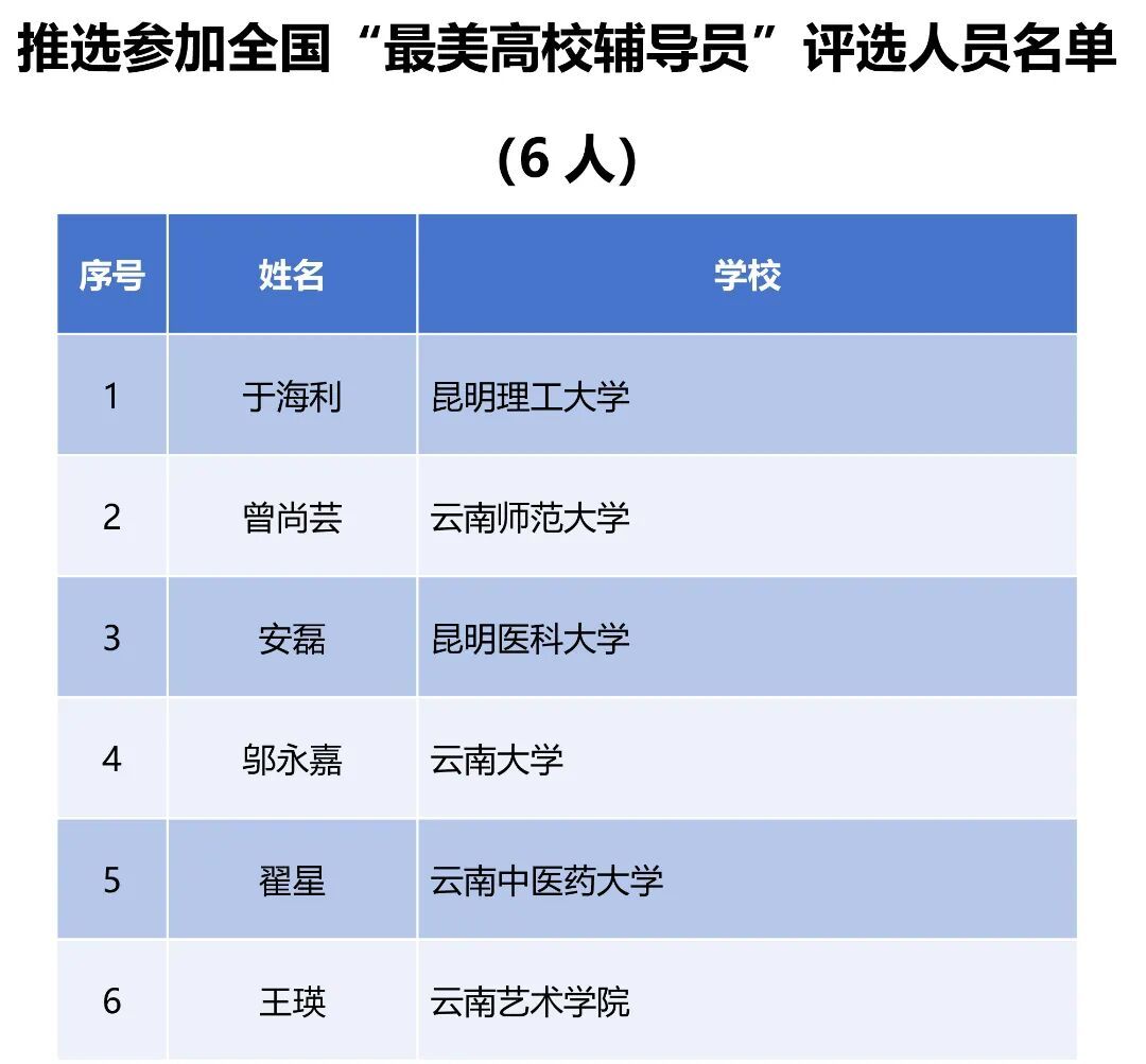 根据《教育部办公厅关于开展 “最美高校辅导员”“最美大学生” 推选展示活动的通知》要求,省教育厅、省委宣传部联合印发《关于开展2026年度云南省“最美高校辅导员”和“最美大学生”推选展示活动的通知》。经各地各校推荐、专家评审,现对 2026年度10名云南省“最美高校辅导员”人选予以公示,并结合 2025 年度“最美高校辅导员”评选结果择优确定6 名,推荐参加全国“最美高校辅导员”评选、2026年度10名云南省“最美大学生”予以公示并推荐6名参加全国“最美大学生”评选(详见下表)。