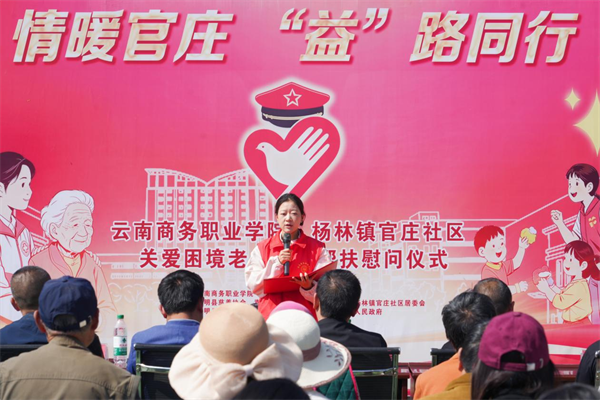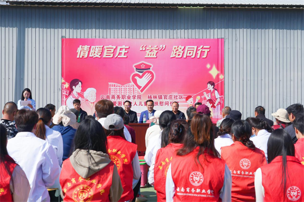云南网讯(记者 高艺萌)3月31日,一场以“情暖官庄 ‘益’路同行”为主题的宣讲暨公益实践活动在昆明市嵩明县杨林镇官庄社区举行。在嵩明县民政局、杨林镇政府及官庄社区的支持下,云南商务职业学院师生走进社区,为困境老人和儿童送去暖心物资与真挚关怀。
