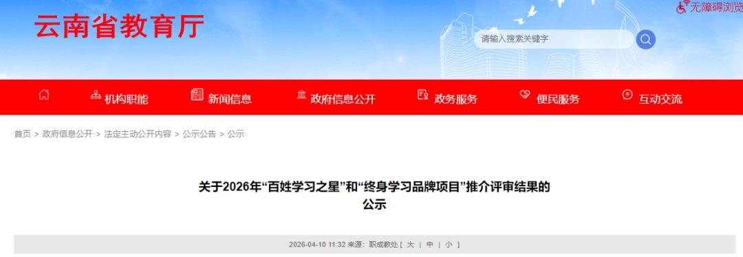 看点 2026年4月10日,云南省教育厅公示了“关于2026年‘百姓学习之星’和‘终身学习品牌项目’推介评审结果”。