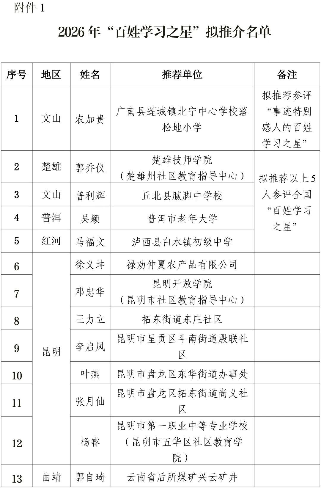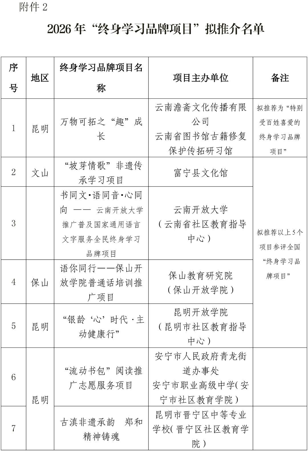 原标题:云南省教育厅公示2026年“百姓学习之星”和“终身学习品牌项目”推介评审结果