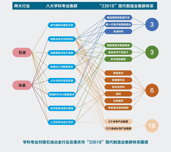 学校围绕石油冶金行业转型升级、国家及地方关于能源、新材料、人工智能、“双碳”目标、生态文明建设等重大发展战略需求,坚持“强工、厚理、兴文、促交叉”的思路,顺势而为,凝练形成了油气勘探与绿色开发、低碳冶金与先进材料、高端装备与智能制造、能源化工与智慧安全、土木水利与生态环境、数理科学与大数据技术、经济贸易与现代管理、人文科学与艺术设计等八大学科集群。