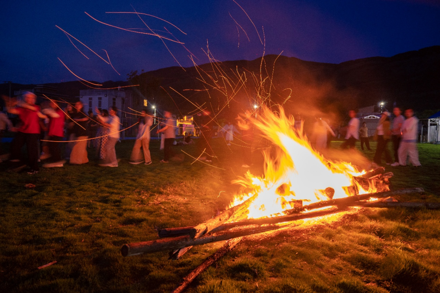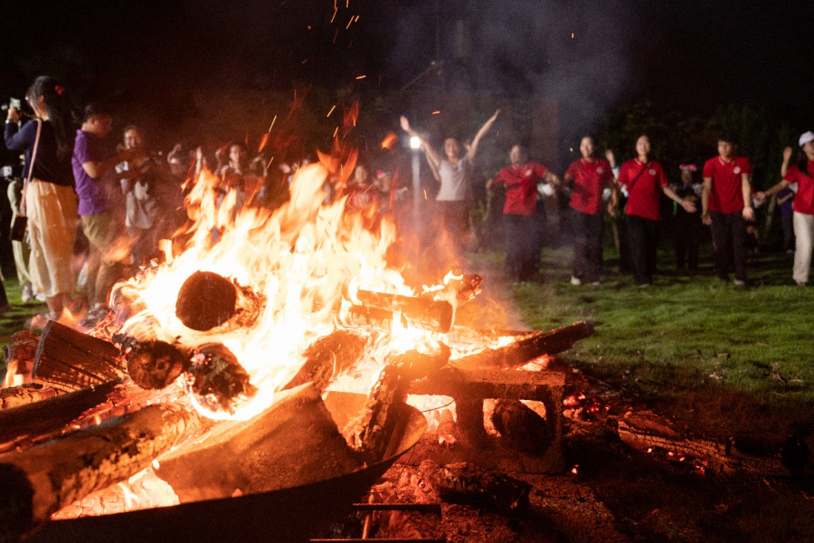 7月18日晚,2025“多彩中国云南行”应用新闻传播融媒体实训营师生在红河哈尼族彝族自治州蒙自市格早寨村汇聚,共庆彝族火把节。篝火冲天而起,映照着百余名青年学子的脸庞。各高校师生们围绕火堆构成同心圆,踏着欢快的节奏载歌起舞。火光跃动间,欢呼声、音乐声、噼啪燃烧声交织。
