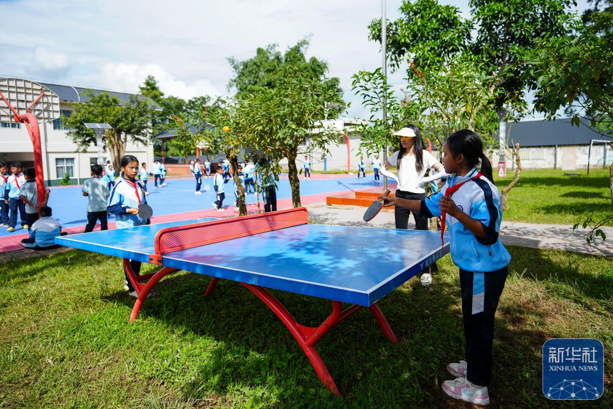 ↑ 9月15日,戈的小学学生课间在打乒乓球。
