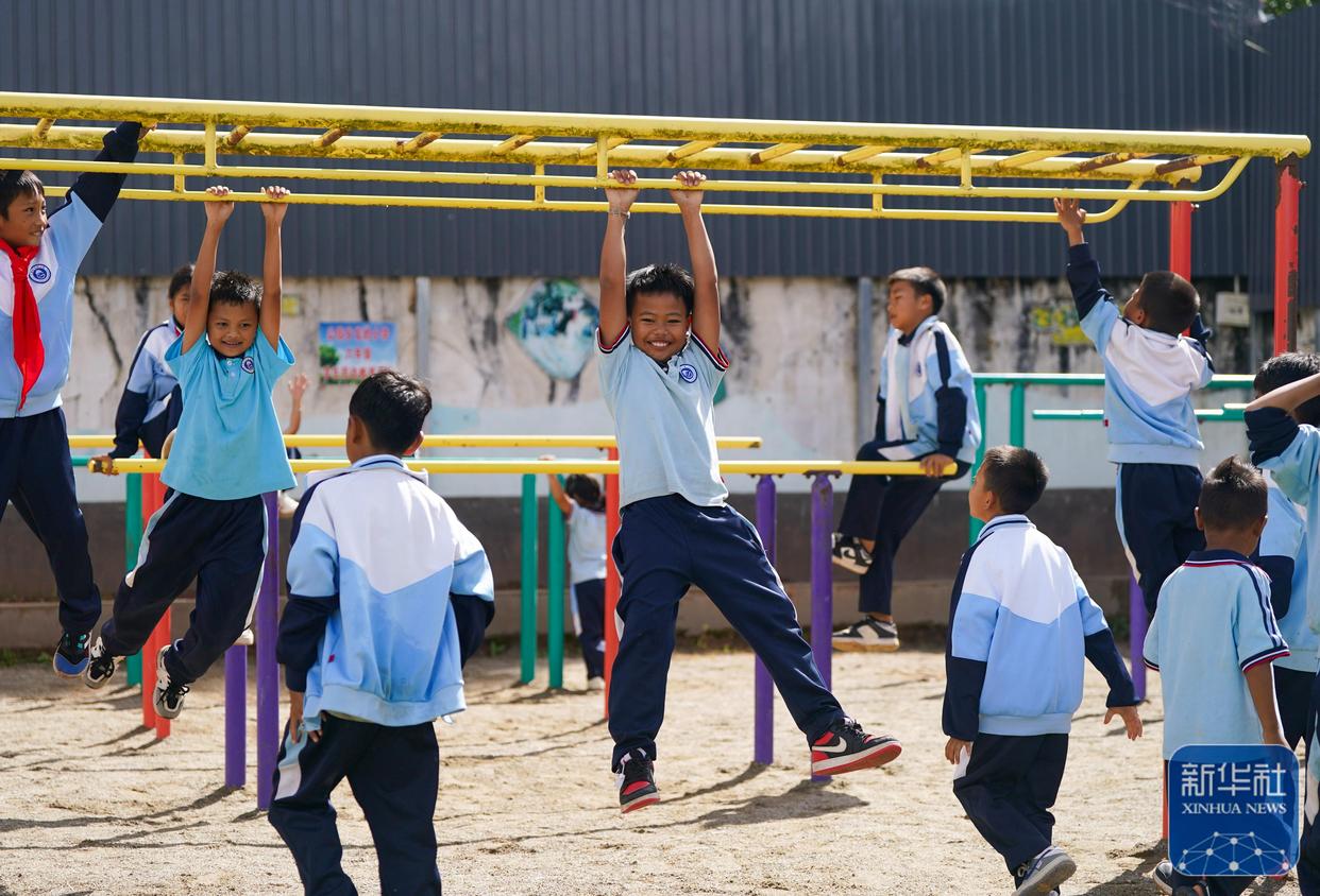 ↑ 9月15日,腊福小学学生课间在操场做游戏。
