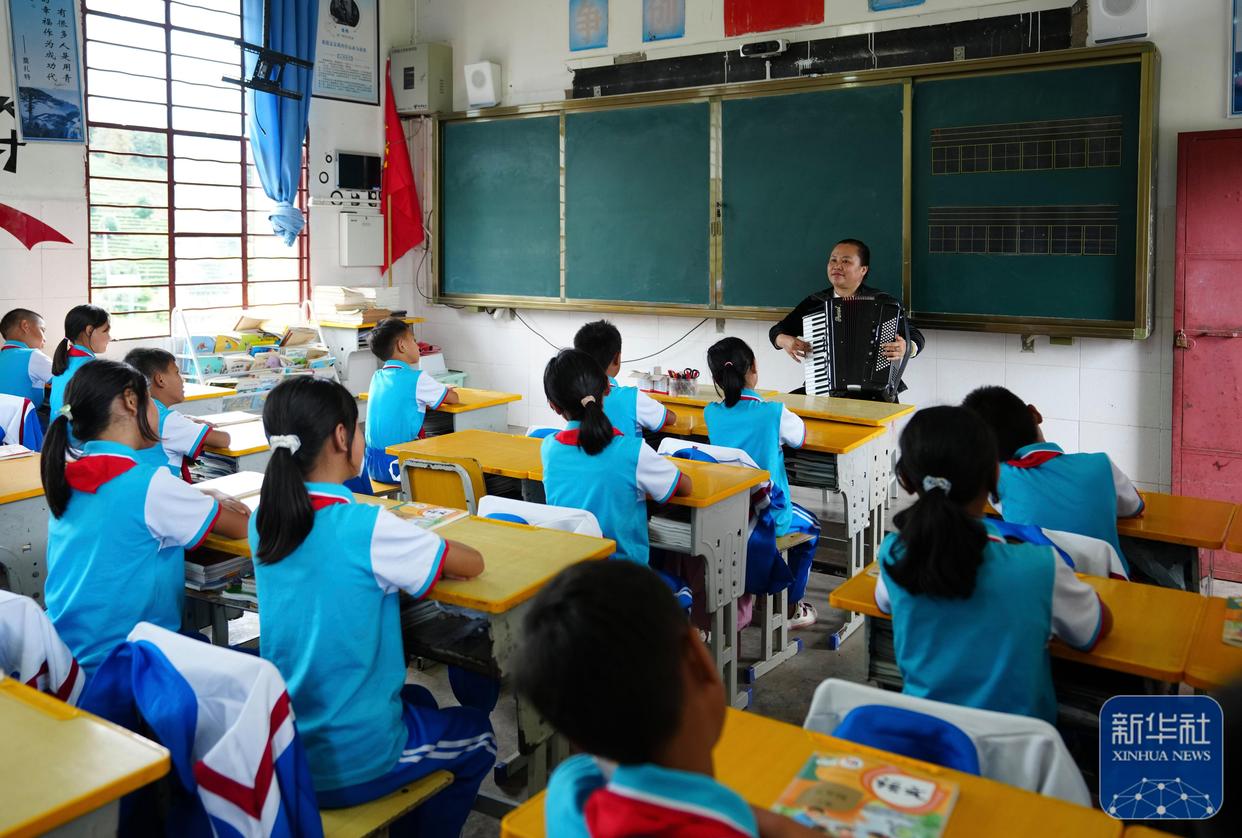 ↑ 9月15日,腊福小学一名老师在教室里带领学生上音乐课。