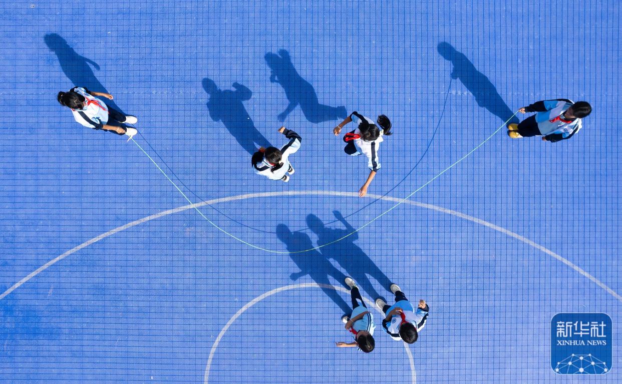 ↑ 9月15日,戈的小学学生课间在操场跳绳(无人机照片)。