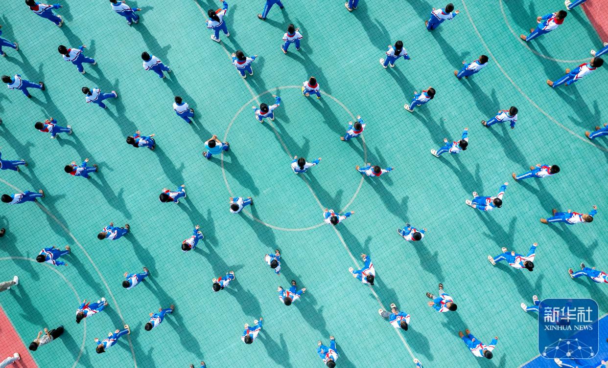 ↑ 9月15日,腊福小学学生在操场做课间操(无人机照片)。