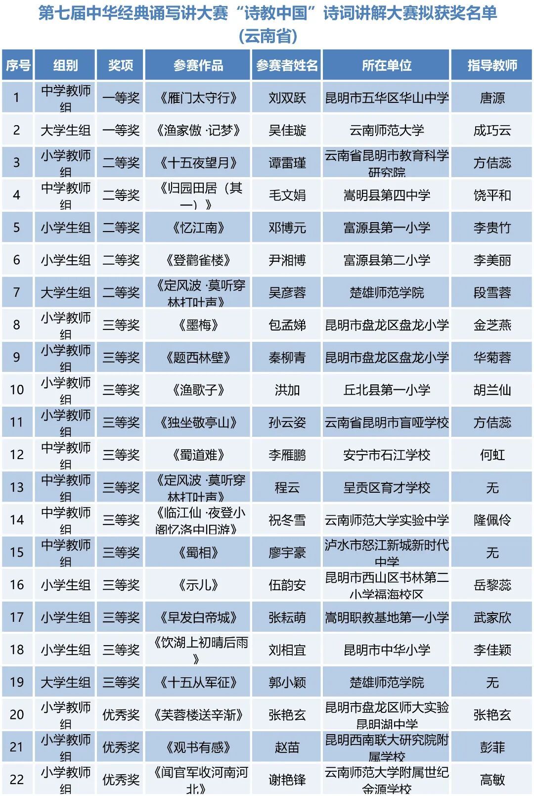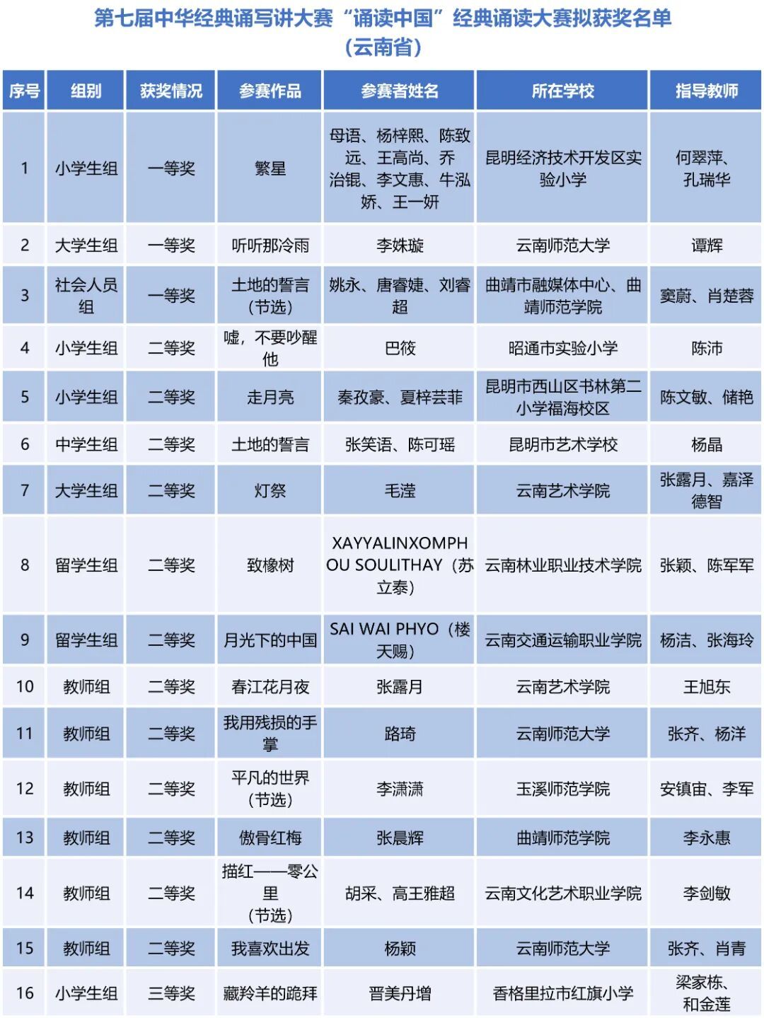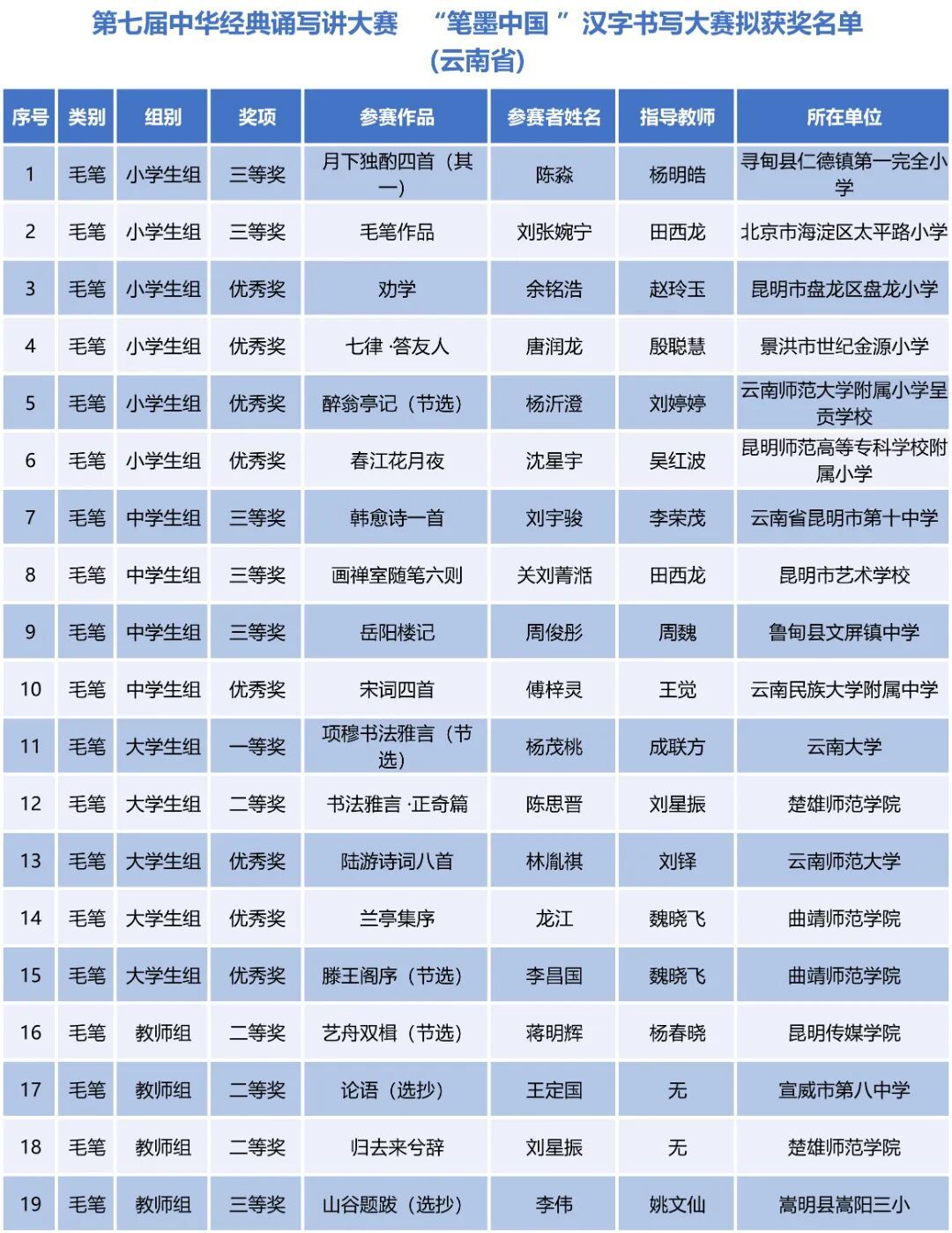 原标题:第七届中华经典诵写讲大赛获奖名单揭晓,云南241个作品拟获荣誉