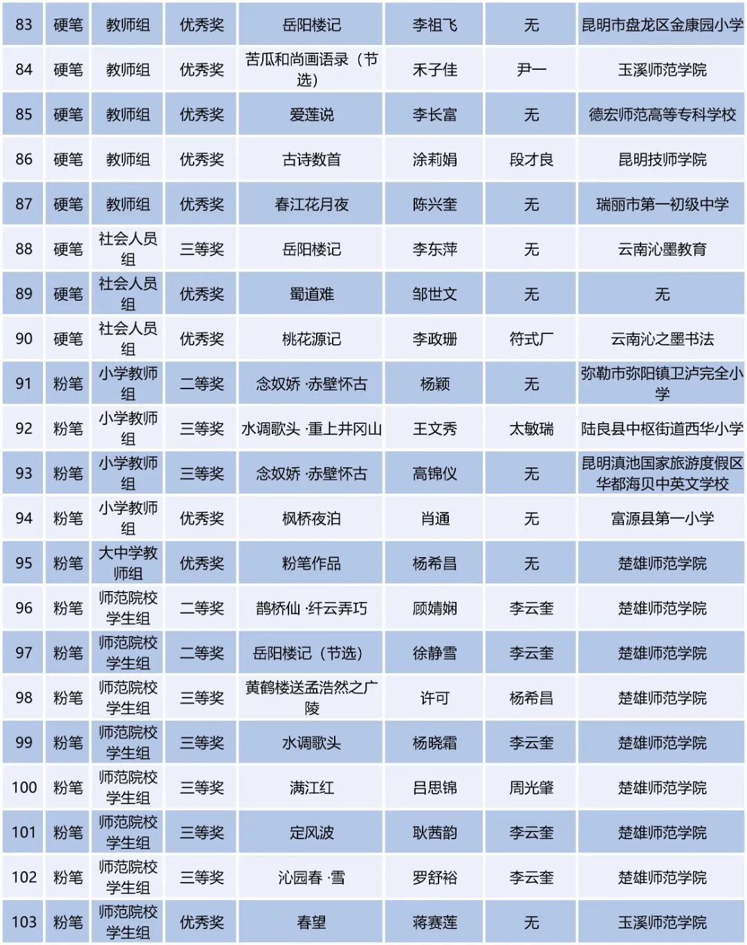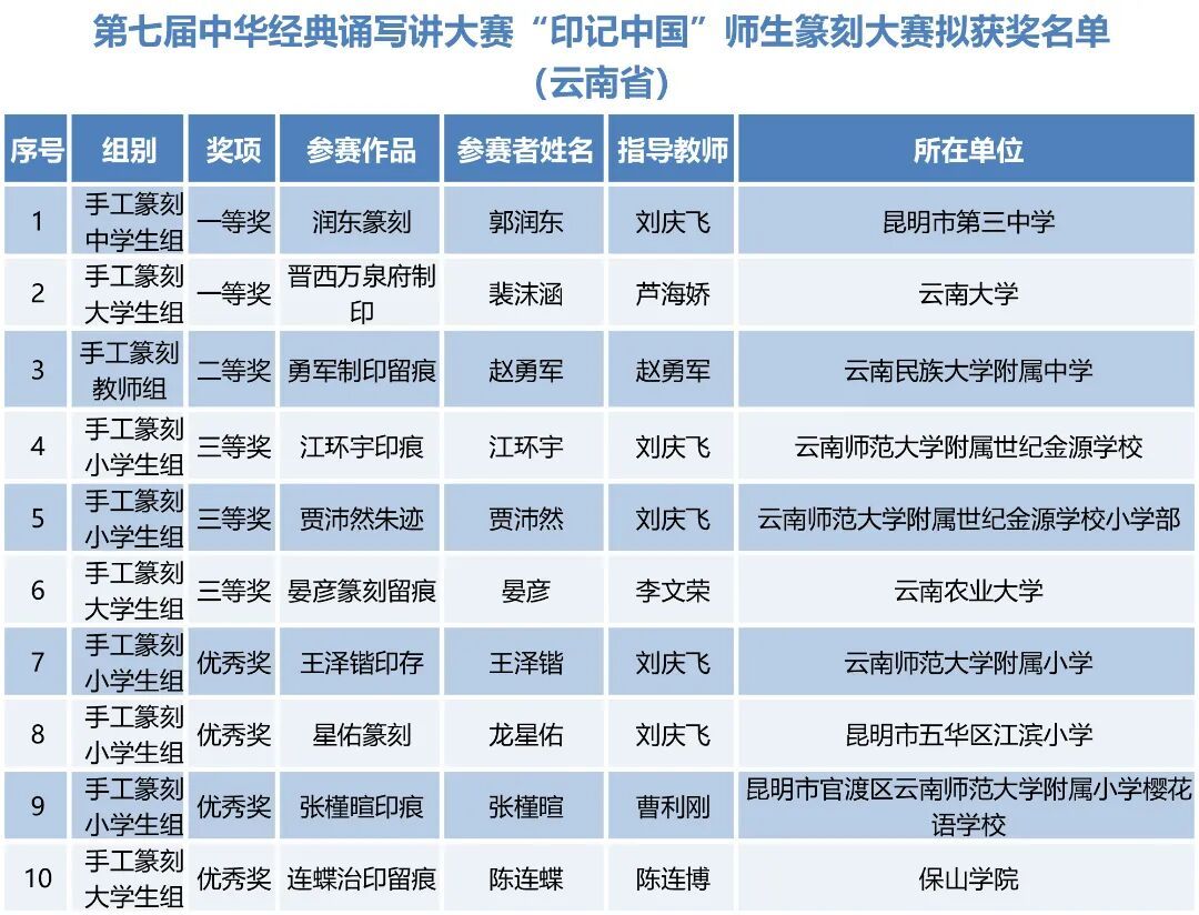 看点 近日,第七届中华经典诵写讲大赛全国获奖名单公示,云南省在本次大赛的4项赛事(“笔墨中国 ”汉字书写大赛、“诵读中国”经典诵读大赛、“印记中国”师生篆刻大赛、“诗教中国”诗词讲解大赛)中取得佳绩,共有241个作品获奖。